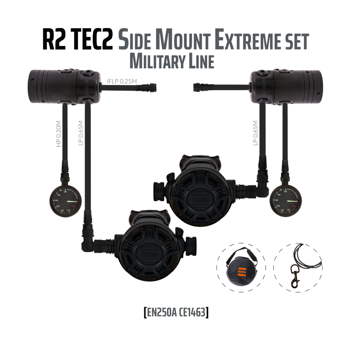 Automaty oddechowe Tecline R2 TEC2 SideMount ML to profesjonalny zestaw Side Mount Extreme – Military Line, zaprojektowany specjalnie dla nurków wykorzystujących konfigurację sidemount. Model spełnia normę EN250A:2014, dlatego zapewnia bezpieczną i stabilną pracę również w zimnych wodach. Zestaw powstał zgodnie ze specyfikacją dla jednostek specjalnych, a więc łączy maksymalną funkcjonalność z podwyższoną odpornością mechaniczną.