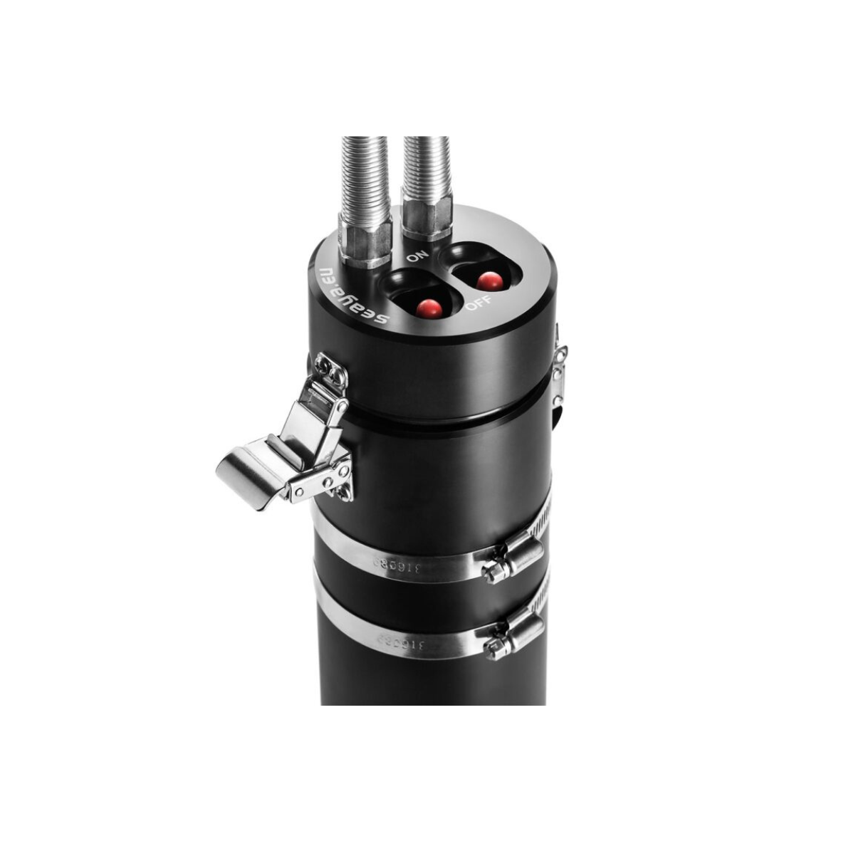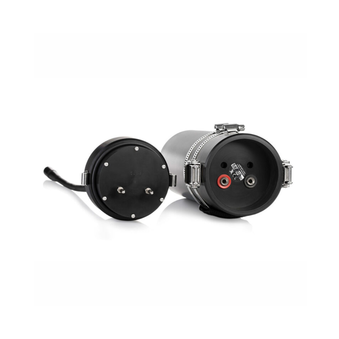 Całkowicie zamknięty akumulator chroni dodatkowa pokrywa wewnętrzna ze złączami bananowymi, natomiast system zacisków z blokadą zapobiega przypadkowemu otwarciu kanistra. Metalowy, niklowany dławik kablowy wykonany ze stali nierdzewnej zapewnia odpowiednie uszczelnienie i chroni przewód przed uszkodzeniem mechanicznym.
