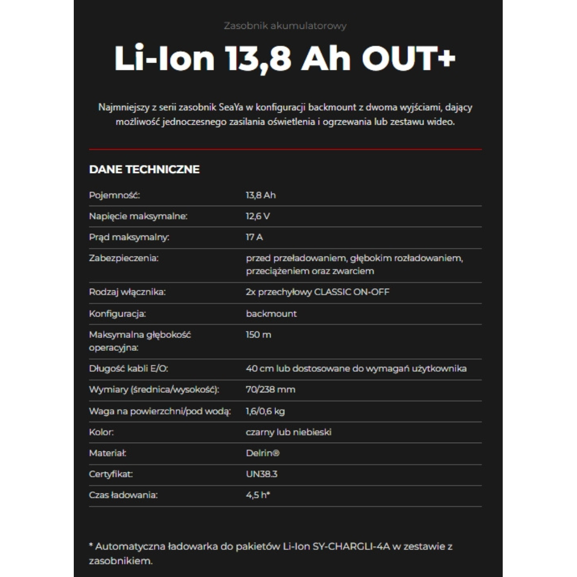 Akumulator o pojemności 13.8Ah zbudowany jest z wyselekcjonowanych ogniw Li-Ion Panasonic, dlatego zapewnia stabilne napięcie 12.6V oraz maksymalny prąd do 17A. Konstrukcja 3S gwarantuje kompatybilność z oświetleniem nurkowym oraz systemami ogrzewania suchego skafandra.