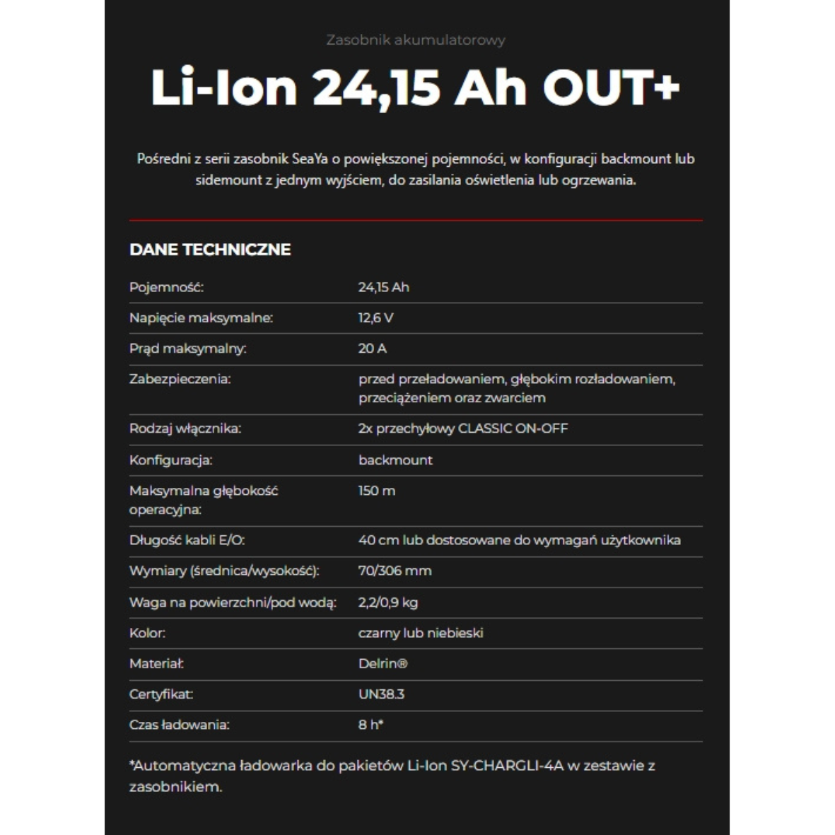 Kanister produkowany jest w Polsce, a jednocześnie wykorzystuje komponenty najwyższej jakości z Unii Europejskiej i USA. Dzięki temu bateria SeaYa Li-Ion 24.15Ah dwa wyjścia łączy solidność wykonania z trwałością i odpornością na intensywne użytkowanie.