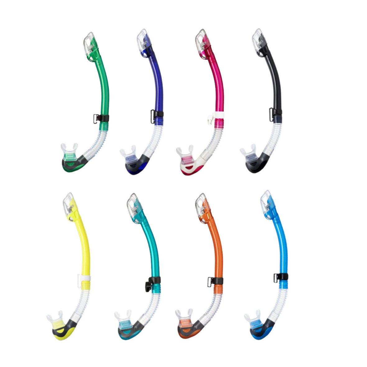 Unikalny, dwuczęściowy system mocowania umożliwia ustawienie fajki pod odpowiednim kątem, dlatego zmniejsza opory wody i poprawia komfort. Co więcej, możliwość regulacji w pionie i poziomie pozwala idealnie dopasować fajkę do maski.