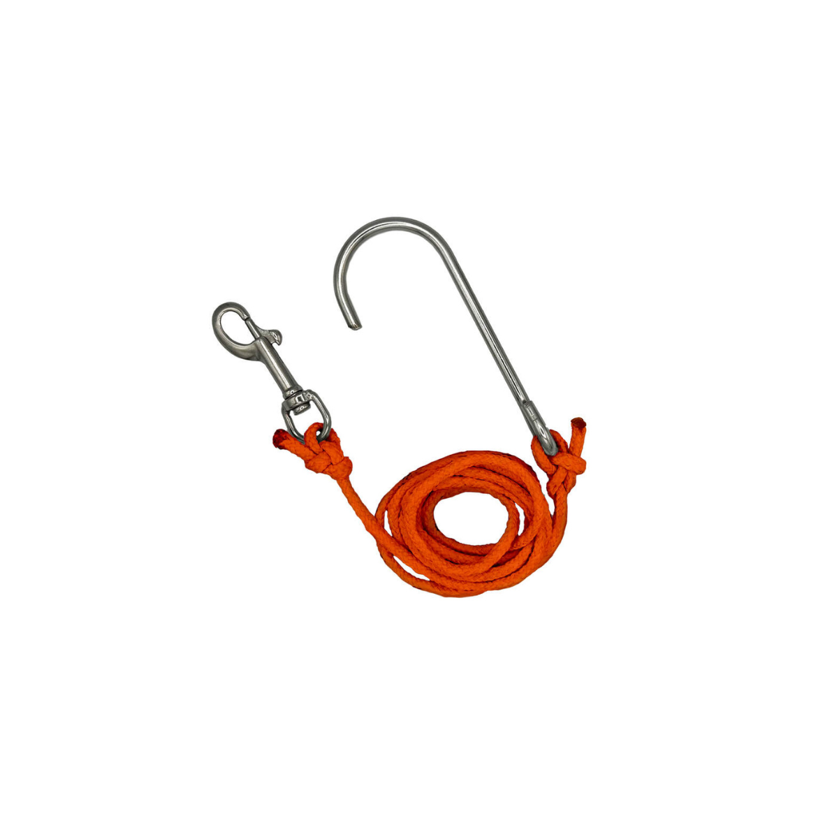Hak został wykonany z wysokiej jakości stali nierdzewnej, co gwarantuje odporność na korozję i trwałość w trudnych warunkach. W zestawie znajduje się również mocna linka z karabińczykiem, umożliwiająca szybkie mocowanie do D-ringa w kamizelce.