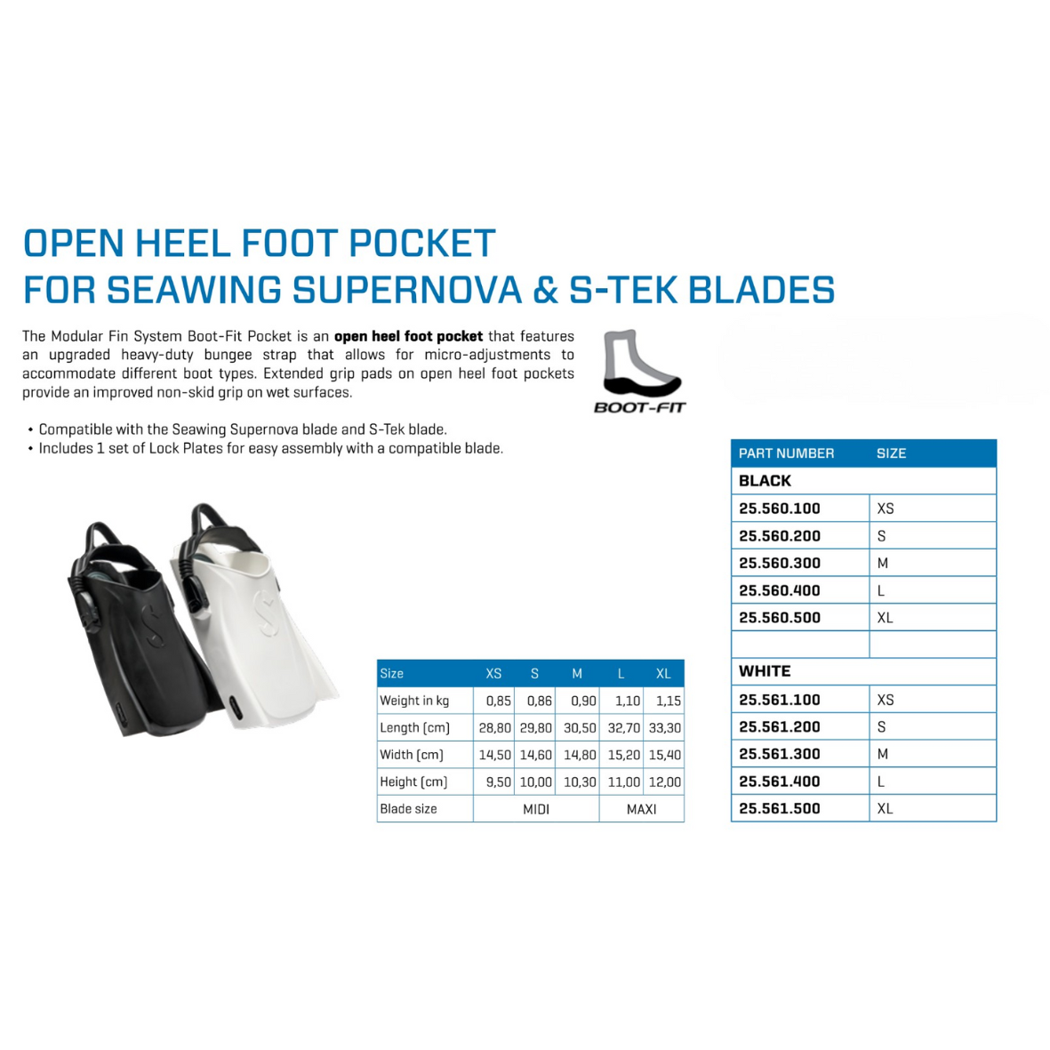 System Seawing Supernova pozwala swobodnie łączyć kieszenie na stopę z różnymi ostrzami. Kalosz typu Boot-Fit Pocket współpracuje z łopatą Seawing Supernova oraz S-Tek, dlatego umożliwia dopasowanie konfiguracji do stylu nurkowania. Co więcej, prosty system Socket-Lock pozwala szybko połączyć kalosz z ostrzem bez użycia specjalistycznych narzędzi.