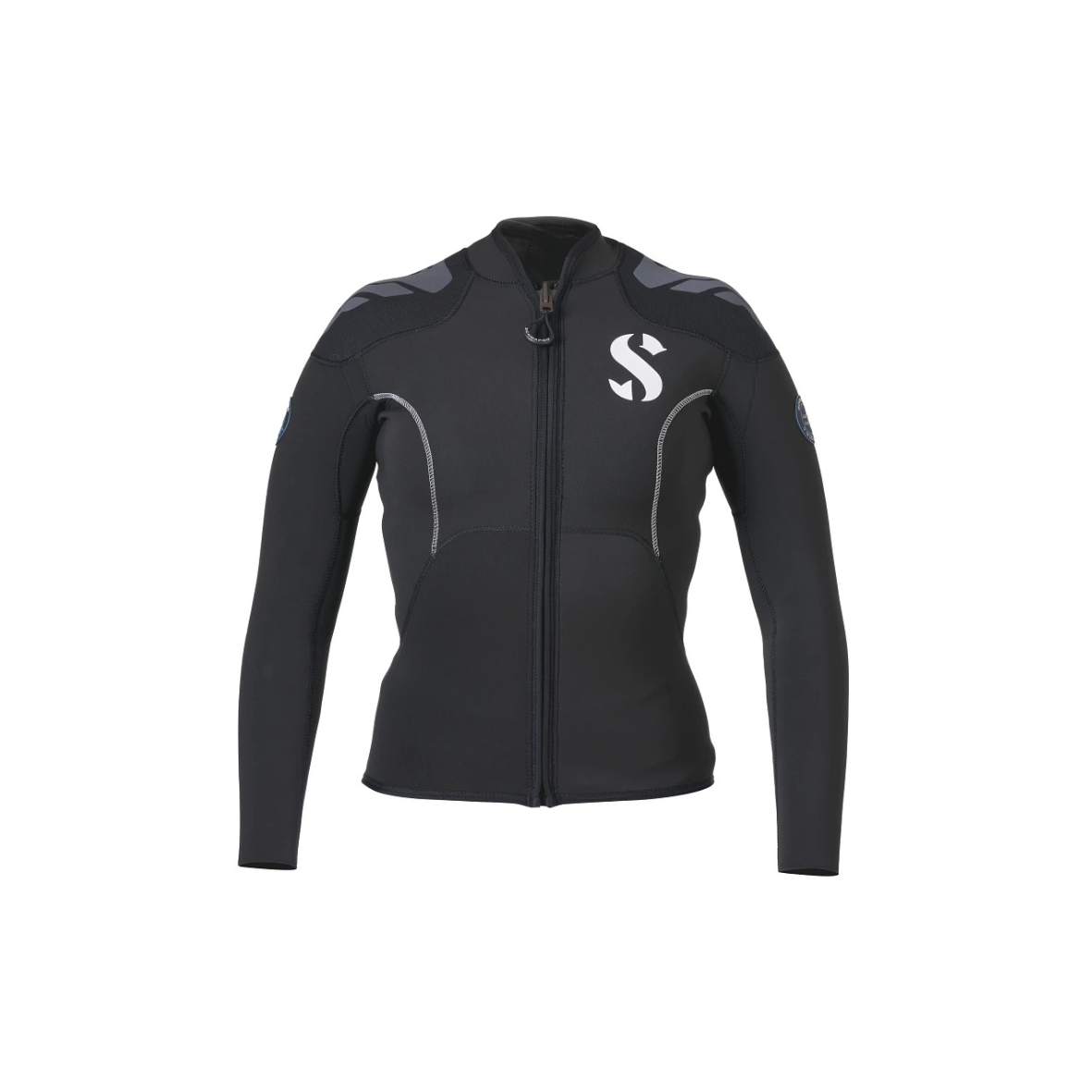 Model Everflex Yulex 3 mm damski wyposażono w pionowy zamek błyskawiczny z przodu, który ułatwia zakładanie i zdejmowanie topu. Mankiety na nadgarstkach wykończono techniką fuse-cut, co zapewnia wysoką elastyczność i komfort, nawet przy częstym użytkowaniu. Dodatkowo na ramionach zastosowano wzmocnione, odporne na ścieranie panele z nadrukiem, które chronią materiał przed zużyciem powodowanym przez kamizelkę wypornościową BCD.