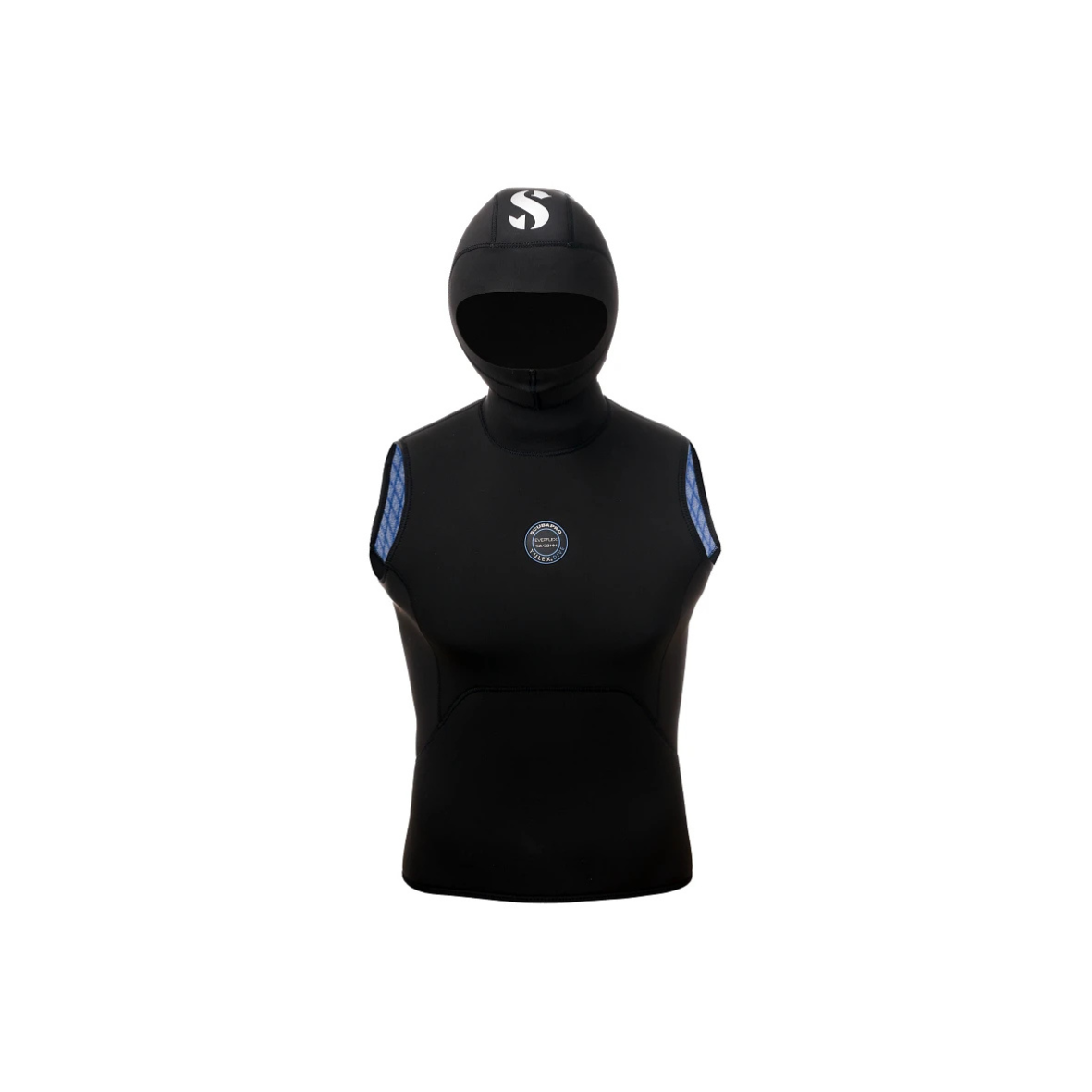 Zintegrowany kaptur o grubości 3 mm skutecznie chroni głowę przed wychłodzeniem. Dodatkowo 2-milimetrowa uszczelka twarzowa ogranicza napływ wody i minimalizuje straty ciepła. Wnętrze kamizelki wyłożono połączeniem niebieskiego polaru Diamond Span oraz czarnego elastycznego poliestru. Co istotne, czarny poliester powstaje z przetworzonych butelek plastikowych, dlatego produkt wpisuje się w ekologiczne podejście marki Scubapro.