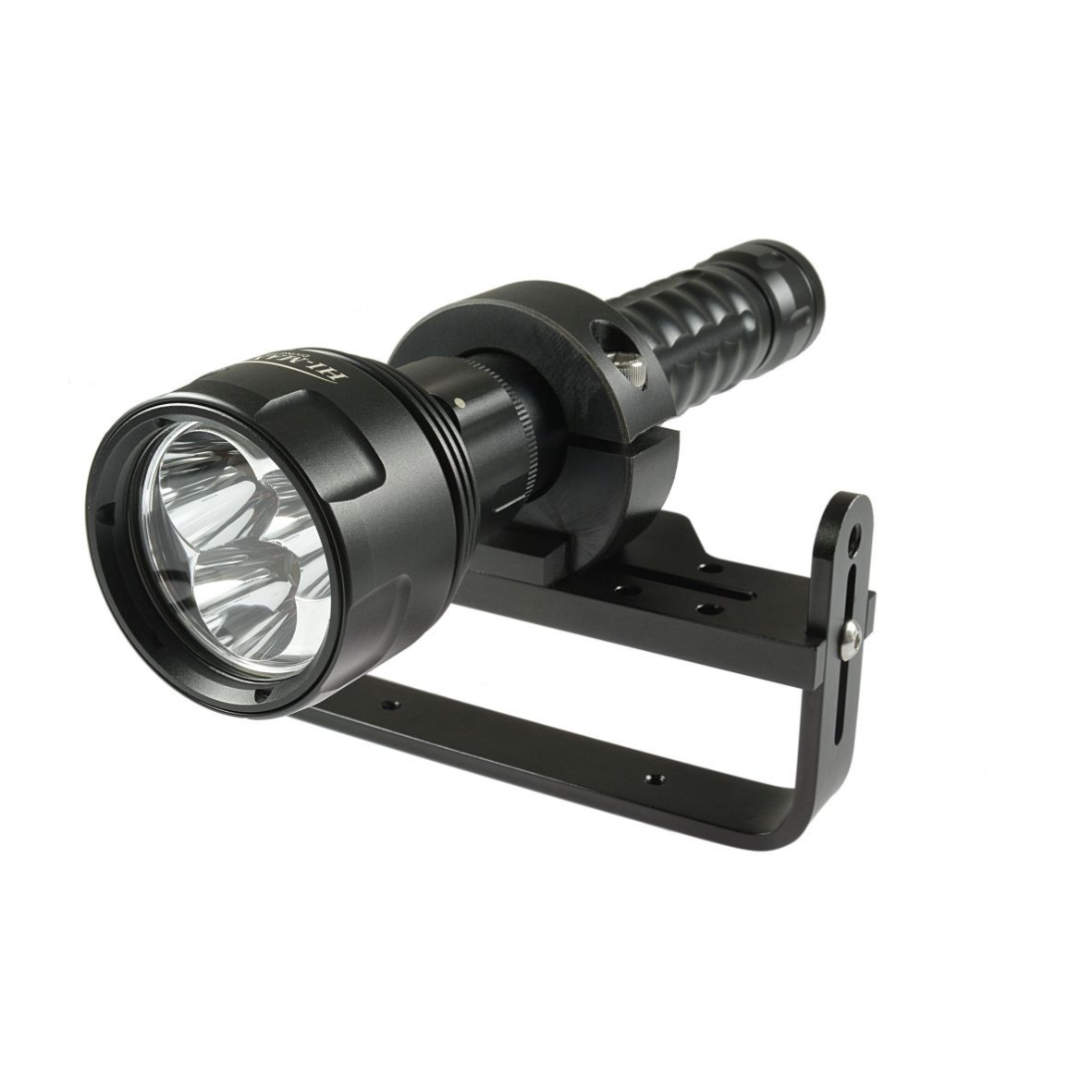 Dołączony uchwyt Goodman z obejmą uniwersalną pozwala na stabilne zamocowanie latarki na dłoni, jednocześnie pozostawiając palce wolne do obsługi sprzętu. To rozwiązanie szczególnie cenione przez nurków technicznych, ponieważ zwiększa kontrolę nad światłem oraz poprawia ergonomię podczas długich nurkowań.
