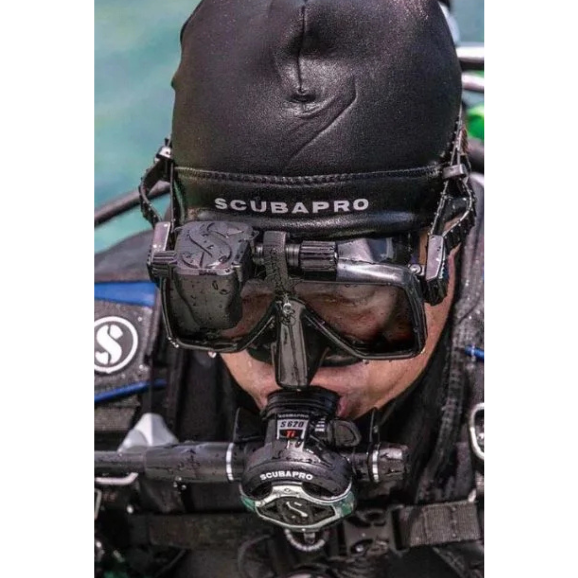 Maska Scubapro Frameless z uchwytem HUD łączy komfort klasycznej bezramkowej maski z możliwością montażu komputera nurkowego. Dzięki zintegrowanemu adapterowi HUD maska umożliwia bezpieczne umieszczenie komputera głośnomówiącego Galileo HUD, co pozwala śledzić parametry nurkowania bez odrywania wzroku od podwodnego świata. Prostokątna, pojedyncza soczewka zapewnia wyraźne pole widzenia zarówno z przodu, jak i na bokach. Ponadto, maska sprawdzi się zarówno podczas nurkowań rekreacyjnych, jak i eksploracyjnych.