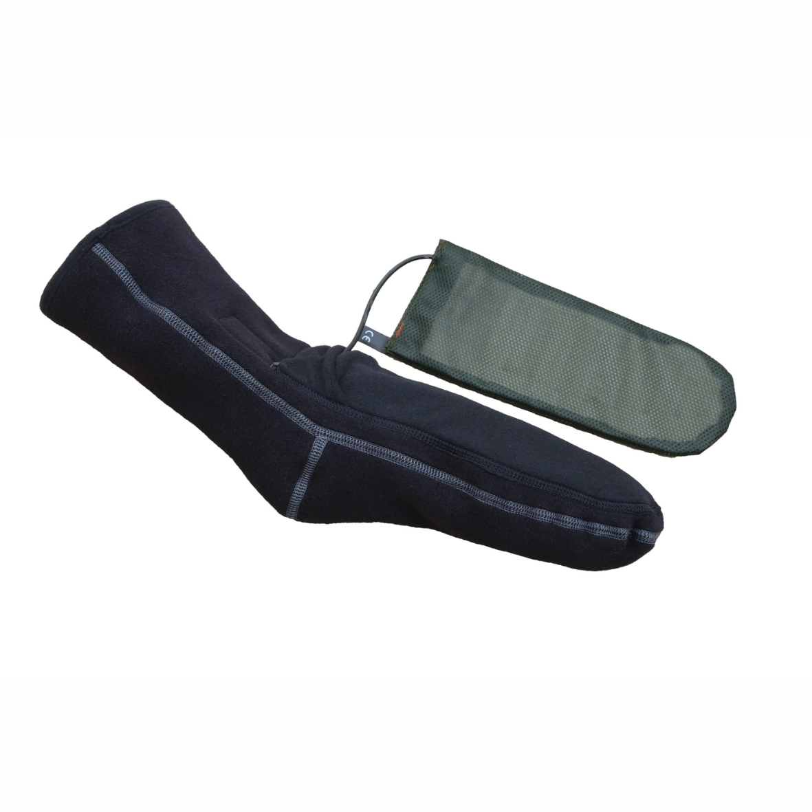 W skarpetach zastosowano panel grzewczy umieszczony na wierzchniej stronie stopy, który generuje ciepło dokładnie tam, gdzie jest najbardziej potrzebne. W zależności od rozmiaru maksymalna moc wynosi od 8 W do 13,5 W na każdą skarpetę, dlatego system zapewnia równomierne ogrzewanie całej powierzchni stopy. Co istotne, element grzewczy znajduje się blisko wewnętrznej warstwy materiału, więc większość energii trafia bezpośrednio do ciała nurka, a nie do wody.
