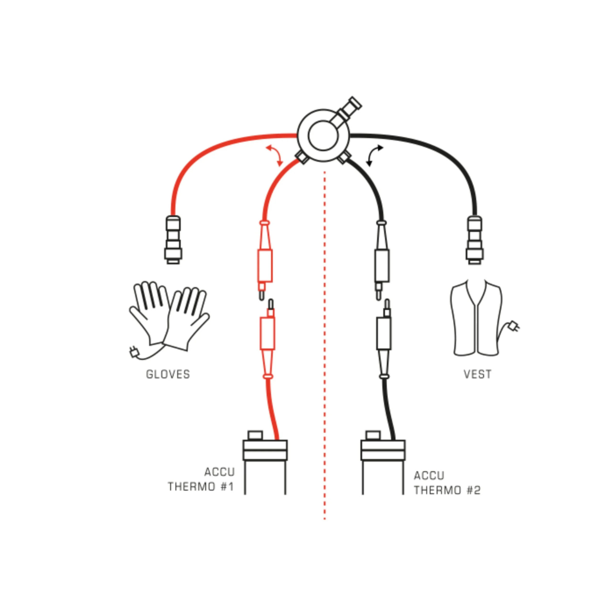 Ammonite Double T-Valve umożliwia konfigurację dwóch oddzielnych obwodów grzewczych. Dzięki temu możesz zasilać, na przykład, kamizelkę z jednego akumulatora, a rękawice z drugiego. Takie rozwiązanie zwiększa niezawodność systemu, ponieważ w razie awarii jednej linii druga nadal działa.