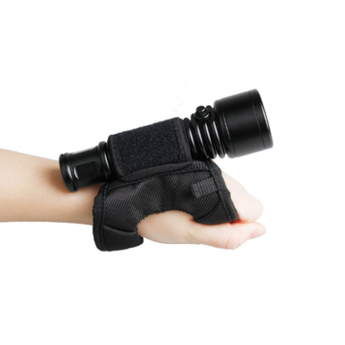 Miękki uchwyt Goodman do latarki nurkowej wykonano z elastycznego, wzmocnionego materiału, który dopasowuje się do dłoni oraz rękawicy. Nie powoduje ucisku, dlatego można go wygodnie używać przez długi czas.