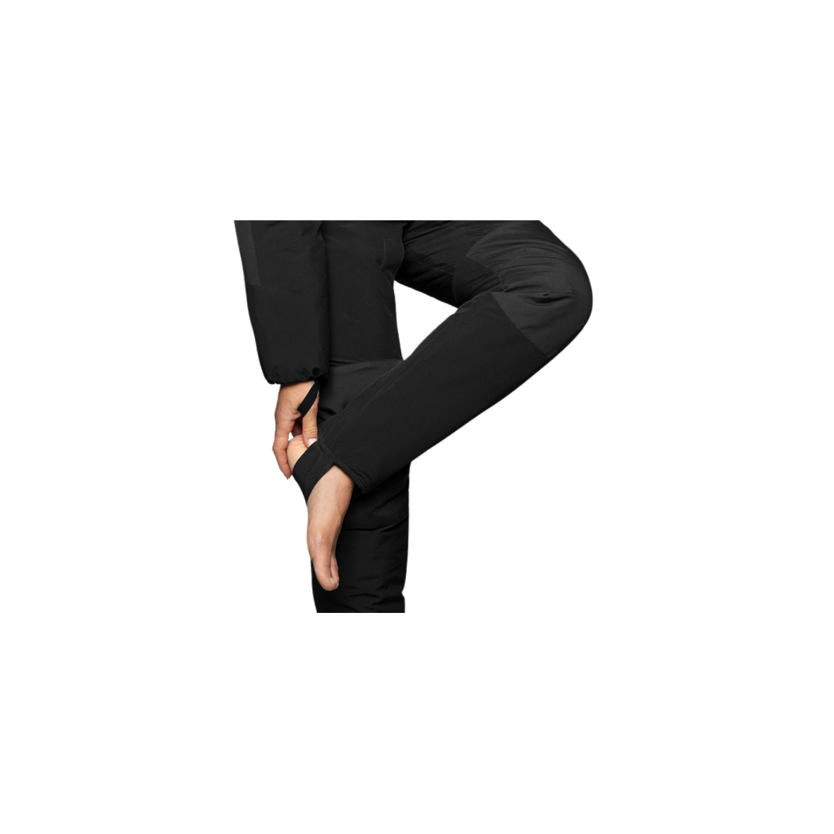 - Dopasowana dolna część nogawek – z szerokimi pętlami na stopy, które poprawiają stabilność i komfort.