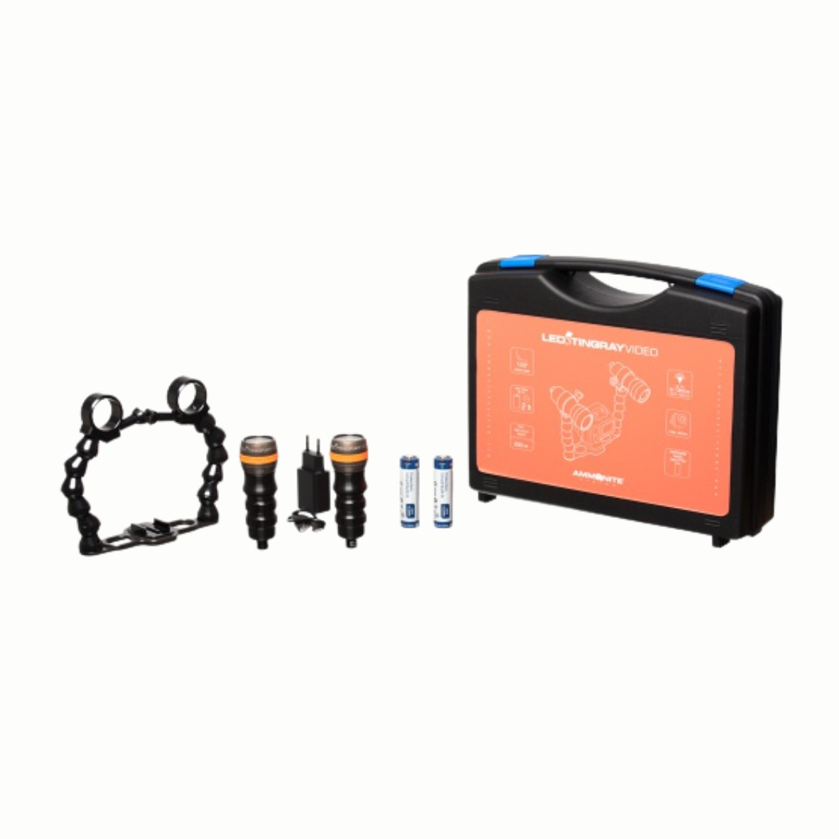 Zestaw latarek Ammonite System LED Stingray Video Mark II. Kompaktowy zestaw do filmowania pod wodą – 2 latarki o mocy do 1300 lm, szeroka i równomierna wiązka światła, czas pracy ok. 2 h. Wytrzymała konstrukcja do 200 m głębokości, akumulatory 21700 USB-C oraz elastyczne ramiona w komplecie. Gotowe rozwiązanie dla wymagających nurków.